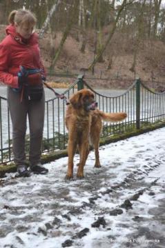 „Pongo, smutny chłopak, który nieufnie, ale spokojnie do mnie podszedł, pozwolił zapiąć się na smycz i wyjść na wspólny, przyjemny spacer. Spacer, który pozwolił nam się poznać i sprawdzić jak Pongo zachowuje się na otwartej przestrzeni. Okazuje się, że psiak jest bardzo kochanym stworzeniem, który chętnie się bawi, a za smakołyki potrafi pokazać swoje umiejętności . Teraz też wiem, że jest łasuchem,no i dzięki temu za pomocą pozytywnych wzmocnień typu smaczki, można go jeszcze wiele nauczyć. Pongo nie oddala się od człowieka, nie ciągnie, rozgląda się tylko z ciekawością w miejscach spacerowych. Obserwuje ludzi i inne zwierzęta. Nie jest typem psa, który zabiega o czułości, pewnie wcześniej nigdy nie doświadczał takich doznań ze strony człowieka. Potrafi natomiast cieszyć się z tego co człowiek mu ofiarowuje, nienachalne głaskanie czy drapanie za uszami. Myślę, że drzemie w nim ogromny pieszczoch i że to tylko kwestia czasu jak pies się otworzy i pokaże, że jest największym przytulaśnym psem na świecie. Podczas zabaw można wykrzesać z niego odrobinę psiego „uśmiechu” i na widok takiego psa serce od razu się raduje. Wesoły pies od razu wprowadza człowieka w pozytywny nastrój…”
