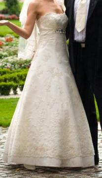 Mam do sprzedania piękną i elegancką suknię ślubną w kolorze mlecznego ecru (najjaśniejszy odcień ecru). Suknia pokryta jest koronką w tym samym kolorze, ornamenty dodatkowo ozdobione są platynową nicią. Ponadto na pasku pod biustem wykonano ozdobę z kryształów Swarowskiego. Zdobienia te pieknie komponują sie z platynowa/ srebrną biżuterią.