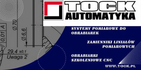 Działalność handlowa firmy TOCk-AUTOMATYKA obejmuje sprzedaż nowoczesnych, szkoleniowych obrabiarek CNC, kompleksowego wyposażenia pracowni CNC i robotyki, sprzedaż elementów konstrukcyjnych do obrabiarek konwencjonalnych i CNC, liniałów pomiarowych i zamienników liniałów pomiarowych uznanych producentów: Heidenhain, RSF, Accurite, Fagor, Anilam, Mitutoyo oraz produkty innych uznanych firm: Intelitek, Siemens. Firma TOCK-AUTOMATYKA posiada w swojej ofercie produkty pozwalające na dowolną modyfikację obrabiarek, wymianę dowolnych elementów konstrukcyjnych i oprogramowania, elementów sterujących i innych: kable sygnałowe, konwertery, interpolatory zewnętrzne, liniały optoelektroniczne szklane TGM TELA, przetworniki obrotowo-impulsowe, indukcyjne liniały absolutne LMKA LMFA LMBA oraz wiele innych. Firma TOCk-AUTOMATYKA posiada wieloletnie doświadczenie w sprzedaży obrabiarek oraz wszelkich dodatkowych elementów wyposażenia technicznego do obrabiarek, wyróżnia się doskonałą znajomością rynku oraz kontaktami biznesowymi, gwarantującymi najlepsze ceny zakupionych produktów i najkrótsze terminy dostaw. Firma TOCK-AUTOMATYKA współpracuje z największymi producentami liniałów pomiarowych do obrabiarek firmami TELA i AMO, jest wyłącznym przedstawicielem handlowym wymienionych firm, dzięki czemu zapewnia najkorzystniejsze warunki zakupu wybranych produktów. Firma TOCK-AUTOMATYKA zapewnia profesjonalne doradztwo przy zakupie dowolnych elementów, umożliwia zastosowanie najnowocześniejszych rozwiązań w obrabiarkach oraz gwarantuje najwyższą jakość produktów, które pochodzą wyłącznie od sprawdzonych dostawców i produkowane są według europejskich standardów.