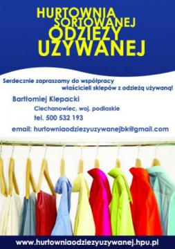 Pragniemy zaoferować państwu I gatunek sortowanej odzieży używanej, gotowej do bezpośredniej sprzedaży. Oferowane ubrania są czyste, nie posiadają oznak zniszczenia. Oferujemy dowóz, wysyłkę kurierem. Hurtownia znajduje się w Ciechanowcu, woj. podlaskie.