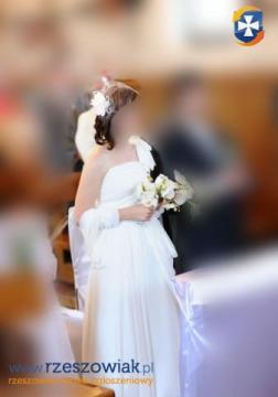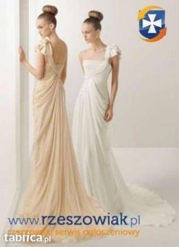 Mam do zaoferowania suknię ślubną - stan znakomity, sukienka po czyszczeniu chemicznym w pralni, wygląda prawie jak nowa. Szyta według wzoru 2012 ekskluzywnej hiszpańskiej marki Rosa Clara - cena oryginalnej sukienki to około 4000 zł - oryginalny model widoczny na zdjęciu. Suknia posiada z tyłu niewidoczne sznurowanie gorsetowe, dzięki temu znakomicie dopasowuje się od sylwetki i nie spada. Jest bardzo wygodna, nie gniecie, nie zsuwa się. Nie ma usztywnień w postaci fiszbin, jedynie lekko usztywniany jest stanik, przez co można się w niej czuć bardzo swobodnie. kokarda na lewym ramieniu ukrywa cieniutkie ramiączko, które "podtrzymuje" dodatkowo suknię, dlatego na pewno się ona nie zsunie.