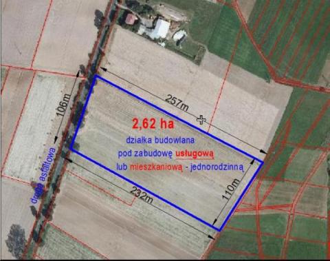 Sprzedam działkę BUDOWLANĄ z możliwością zabudowy USŁUGOWEJ o powierzchni 2,62ha i szerokości 106m w miejscowości Bogucin (15 km od Lublina tuż przy trasie S17 w kierunku Warszawy)