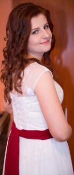 Ramiona i gorset są pokryte koronką, cały dół jest pokryty bardzo delikatnym, matowym jedwabiem. Pas z bordowego, matowego materiału można zawiązać na krawatkę tak jak u mnie, można zawiązać z tyłu na kokardę lub całkowicie go odczepić. Gorset jest mocny, ładnie modeluje sylwetkę, lecz jednocześnie suknia jest lekka.