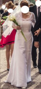 Suknia szyta w firmowym salonie sukien ślubnych w Lublinie z kolekcji 2014 r. Suknia jest w bardzo dobrym stanie po czyszczeniu chemicznym w kolorze białym, lekka i wygodna w zestawie przepiękne koronkowe bolerko i pas ozdobny, bez trenu. Możliwość ubioru sukni bez bolerka. Rozmiar 40/42 ze względu na to że jest wiązana można ją dopasować indywidualnie. Suknia szyta na wzrost 173 cm+obcas 6 cm. Koszt sukni w oryginale to 2 900 zł, więc zapraszam do przymierzenia w Lublinie, Poniatowej, Puławach, cenę daję bardzo atrakcyjną gdyż zajmuje niepotrzebnie miejsce, może komuś się jeszcze przyda. Polecam naprawdę warto.