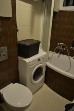 Łazienka razem z toaletą, wanna z parawanem (możliwość brania prysznica), pralka automatyczna
